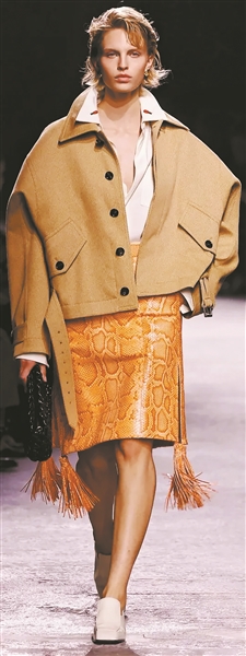 其中,在风格造型上,视觉反差感较强的搭配方案给人带来新鲜感,例如皮质工装外套搭配职业装,翻领短外套搭配透明材质半身长裙,硬朗造型外套搭配柔软针织毛衣内搭等。业内人士认为,随着功能性面料服装持续火热,将会有更多复古元素设计融入其中。