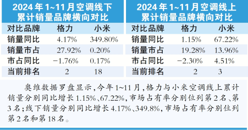 从11年前的“十亿赌约”到如今的“口水战”,格力与小米“长跑竞赛”背后,折射出家电行业的存量市场竞争态势。在经历了快速增长期后,当前我国整体家电行业正进入以产品迭代升级为主的新周期。以空调为例,奥维云网(AVC)推总数据显示,2024年1~11月,空调市场零售额规模为1980亿元,同比-3.2%;零售量规模为5743万台,同比-2.4%。