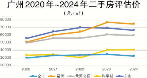 不过对于置业者而言,二手市场还有一个重要的考量,那就是未来的流动性与保值能力。对此,数据也提供了板块价格的视角。全市来看,2024年广州二手房均价为32700元/m2,以5年这一中期维度来看,相较2020年30267元/m2的均价上涨幅度约为8%,而同期涨幅跑赢全市平均水平的板块包括天河公园、琶洲、科学城、东山等,显示出教育资源和产业聚集这两大要素对于房价的关键性作用。