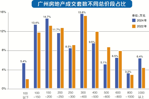 相较之下,新房市场的成交结构呈现出的变化尤其引人注意。近三年数据显示,在各个总价段的成交占比之中,200万元以下的绝对刚需产品占比从2022年的27%明显提升到了33.5%;与此同时800万元以上的改善类产品成交占比从2022年的7.3%提升到了2024年的9.6%。广州楼市的成交结构正在向两端流动,刚改群体市场仍有较大的潜力可以挖掘。从成交的绝对占比也可以看出来,广州楼市仍然是一个由刚性需求主导的市场,他们的购买力与置业预期发挥着更为决定性的作用。