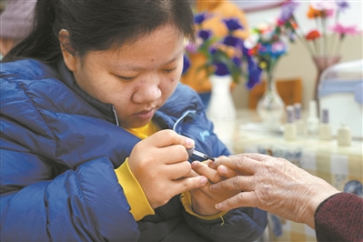 刻苦学习的技能,需要一个展现的舞台。今年重阳节,桃苑福利中心举行敬老活动,为了让莹莹可以在实践中锤炼本领、增强生活信心,中心工作人员鼓励莹莹在现场开设了美甲摊位,化身“美的使者”,用一双巧手为长者们带去了专属美甲服务。