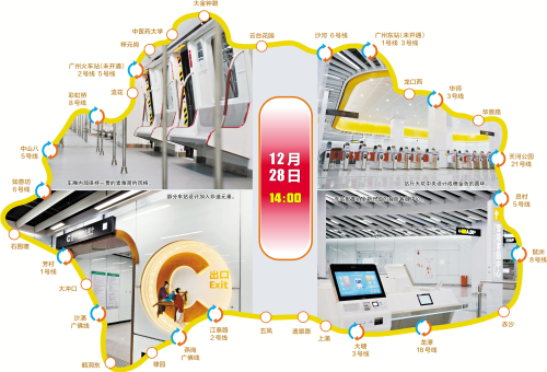 广州首条环线地铁十一号线本月28日14时正式开通初期运营,线路途经天河、白云、越秀、荔湾和海珠五个中心区,以“环”为形,勾勒出广州的“城市圈”“交通圈”和“经济圈”。开通初期,十一号线将有14座车站与既有线路实现换乘,是名副其实的“换乘之王”。开通当天,六号线沙河站同步对外运营。