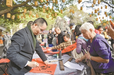 当天上午,摩星岭景区还特地为游客们准备了惊喜福利,200名从摩星岭南门进入园区的游客领到了花车派送的新年福袋。花车旁还有知名书法家现场挥毫泼墨,为游客写福字、送福气。一个个寓意吉祥的“福”字赠予游客,传递着新年的美好祝愿。不少游客手捧“福”字,脸上洋溢着幸福的笑容,纷纷表示要将这份祝福带回家中,与亲朋好友们共享新年的喜悦。