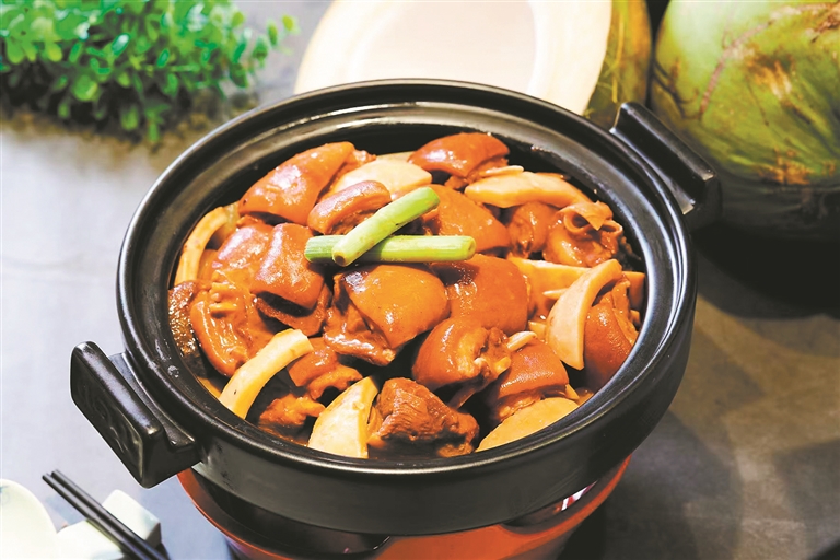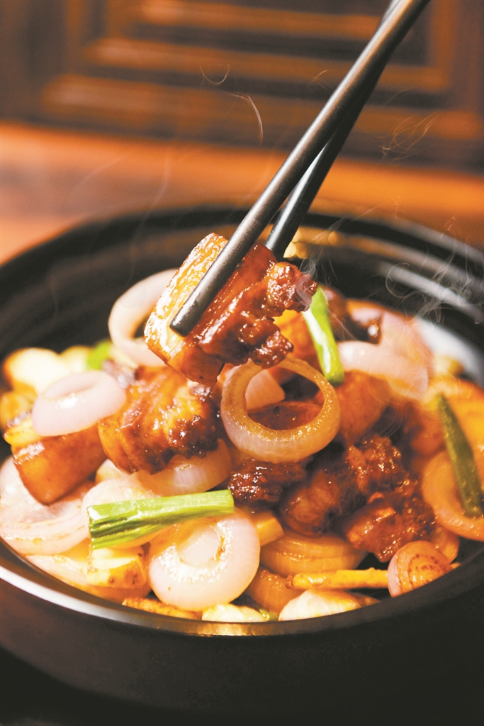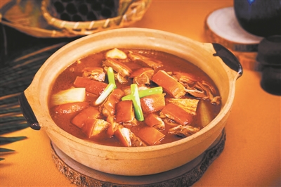 而店中的“秘制羊腩煲”,则为街坊之所爱,由总厨卢镜泉在多年前研制而成,他选用新鲜的羊肉,经过焦糖熏制,去除膻味之余,令羊皮呈现出诱人的色泽。在烹饪过程中,先将羊肉与香料一同炒制,以增强香气并进一步消除膻味。随后,加入花雕酒和特制酱料,底部铺上腐竹、萝卜和马蹄,提升整体风味。