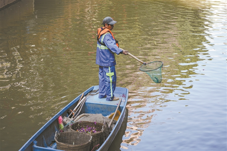 划着小船、挑着竹竿、打捞落花,2.2公里的河涌,他每天要巡逻十几个来回:“这两年,驷马涌越来越漂亮,在美景里工作,是一件美差。”