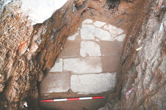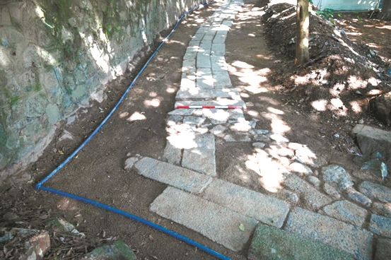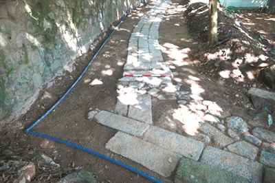 在玉岩书院发现的清代登山古道长约80米,宽0.85米,由3—4排麻石铺就,并蜿蜒向山门延伸。