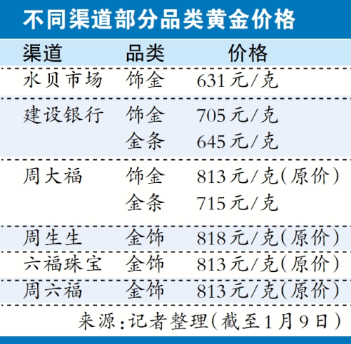而相比批发市场和银行,品牌金店的金价无论线上线下仍旧欠缺价格优势。如1月9日当天,水贝黄金价格仅为631元/克,建设银行的部分黄金首饰克重价格约为698~708元/克,均低于品牌金店促销价。