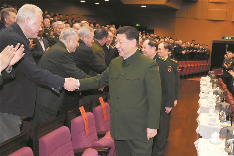 下午4时许,习近平来到老同志中间,全场响起热烈掌声。习近平同大家亲切握手、互致问候,关切询问他们的身体和生活情况,共同回顾过去一年党、国家和军队事业走过的不平凡历程、取得的重大成就。老同志们一致表示,要更加紧密地团结在以习近平同志为核心的党中央周围,坚持以习近平新时代中国特色社会主义思想为指导,深入贯彻习近平强军思想,深刻领悟“两个确立”的决定性意义,坚决做到“两个维护”,贯彻军委主席负责制,弘扬光荣传统、永葆政治本色,坚定信心、团结奋斗,继续为打好实现建军一百年奋斗目标攻坚战,为以中国式现代化全面推进强国建设、民族复兴伟业作出积极贡献。