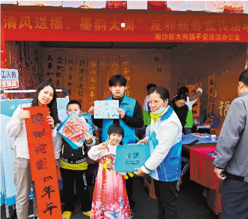 花市上,大岗镇“爱岗青年”群防队伍的志愿者亦齐齐上阵,邀请街坊参与反邪禁毒的互动游戏,派发反邪教宣传手册,耐心讲解邪教的危害和防范方法等。“一边行花街,一边带小朋友学习反邪知识,还能领一副挥春,收获满满。”街坊黎先生表示。