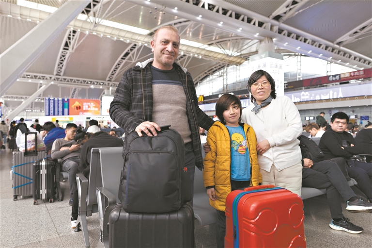 中国女婿侯赛因·沙欣来自土耳其,妻子马女士是湖北人,夫妻俩定居土耳其,今年带上9岁的儿子回中国探亲。“我们昨天到广州,因为我妹妹在这里,我们现在要去桂林看望我父母,今年我们一大家子团圆过年!”马女士告诉记者。