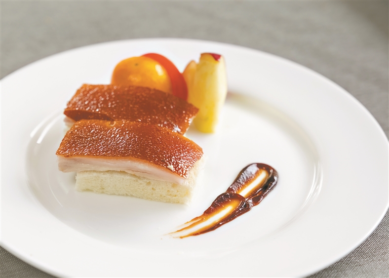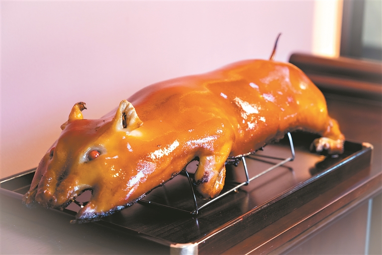 刚烧制出炉的乳猪皮色呈焦糖红色,寓意红皮赤壮,身体健康。黄钊成介绍,“正所谓金猪一开,好事连连,所以第一刀很重要,乳猪的头寓意‘鸿运当头’;乳猪主体部分会切成四列,每列八块,寓意‘四平八稳’;摆盘造型形似阶梯,寓意‘步步高升’,吃的时候蘸取少许猪酱、白砂糖,这些味料与乳猪肉的鲜美相得益彰,丰富了味觉层次。”