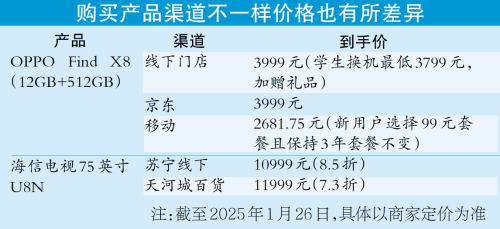 广州日报记者对包括家电、数码产品等多个线上线下渠道价格进行对比,发现部分品类折扣不一、原始定价参差不齐,消费者在购买产品时应更关注到手价。运营商等小众渠道购买手机更划算,但消费者在选购时需注意部分要求一定附加条件。
