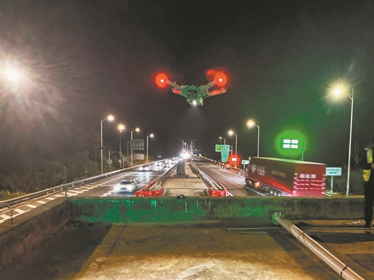 同时,二广高速在九嶷山隧道抗冰驻点处,增设了1个智能巡查“无人机站”,能根据设定的航线智能巡查九嶷山隧道至沙坪隧道路段1.6公里路面的实时交通情况;在竹盖山路段加装了351套照明灯具,在低温雨雪冰冻天气和重大节假日期间,由监控中心远程操控开启,提升过往司乘人员夜间行车的安全性。