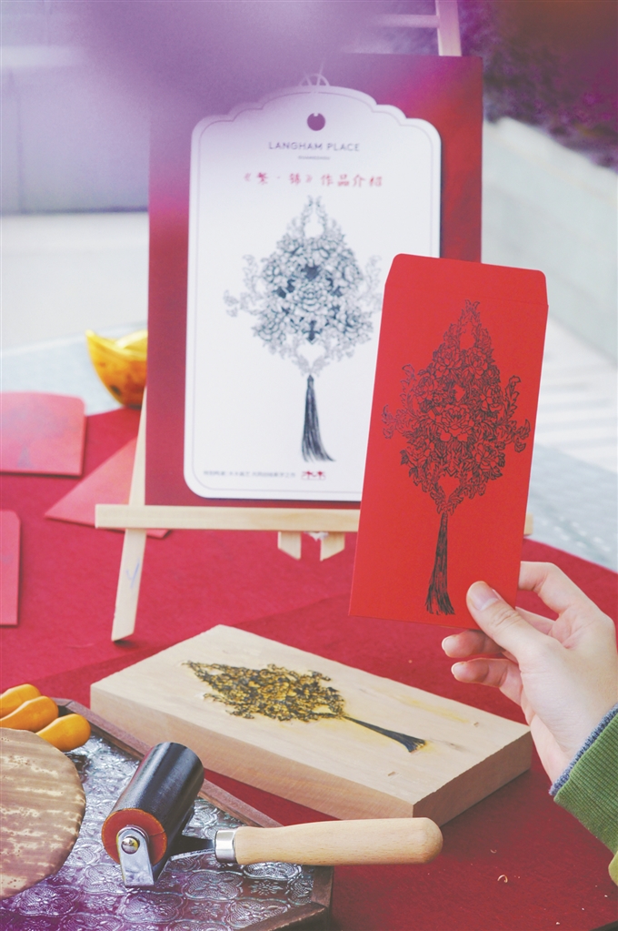 在广州朗豪酒店,木刻、剪纸等被摆设在大堂最显眼的位置。据悉,春节期间,这里每天下午都会举行木刻拓印和剪纸等非遗体验活动,广州木刻艺术家邓志辉将和市民游客一起创作木刻版画,为新春增添文化色彩。