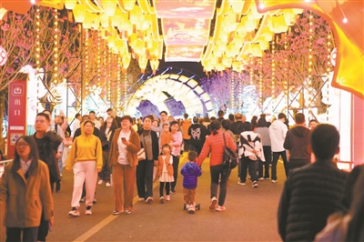 在大湾区灯会上,一群穿着马面裙的女孩穿越廊道,一路和市民游客合影互动。“这些表演的设计独具匠心,充分利用了大湾区灯会的氛围,让人更能沉浸式游览,有‘人在画中游’的感觉。”来自深圳的市民林小姐说。