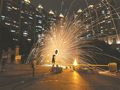 夜幕降临后,一场精彩的打铁花表演将气氛推向高潮。打铁花艺人奋力将滚烫的铁水击向天空,铁水瞬间绽放出绚丽的火花,璀璨夺目。大家纷纷拿出手机拍照,记录这一瞬间。