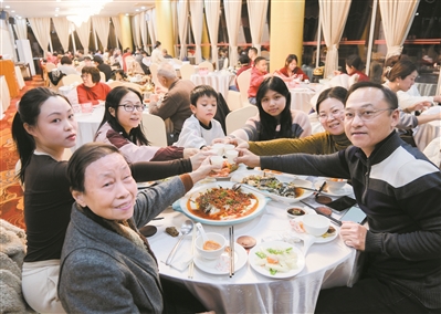 “相较往年,今年小型家庭聚会总量增长明显,餐厅特意推出了更加亲民的4—6人套餐。”广州迎宾馆工作人员表示,还推出非遗表演,增添趣味性。
