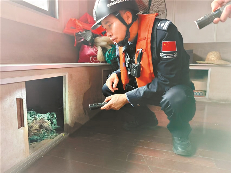 到了码头泊位旁,他与同事相互检查完执勤装备后,登轮查验、人证对照、船体抽查一气呵成,动作干脆利落、检查一丝不苟,完全看不出他是快退休的老民警。