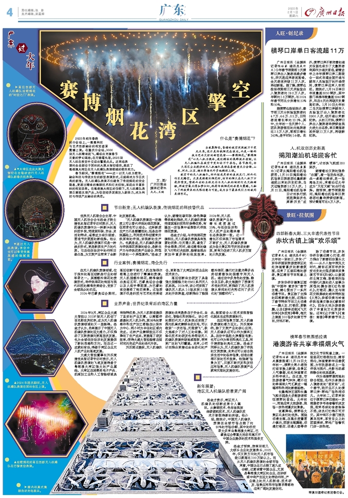 - 赛博烟花 湾区擎空 文、图/广州日报全媒体记者阮元元、王纳 2025年蛇年春晚的分会场上,一幕幕科技与艺术创新融合的视觉盛宴震撼上演。在重庆分会场,3000架无人机精准起飞,编织出充满春节元素的梦幻画卷;在无锡鼋