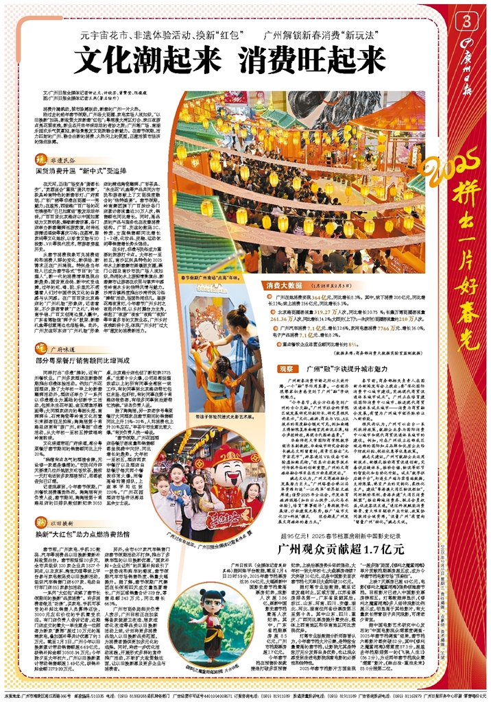 广州日报讯 (全媒体记者莫斯其格)据网络平台数据,截至2月4日23时59分,2025年春节档票房达95.04亿元,大幅刷新中国影史春节档最高票房纪录,观影人次超1.86亿,刷新中国影史春节档最高人次纪录。其中,广东省档期票房超8.5亿元,广州市档期票房超1.7亿元。