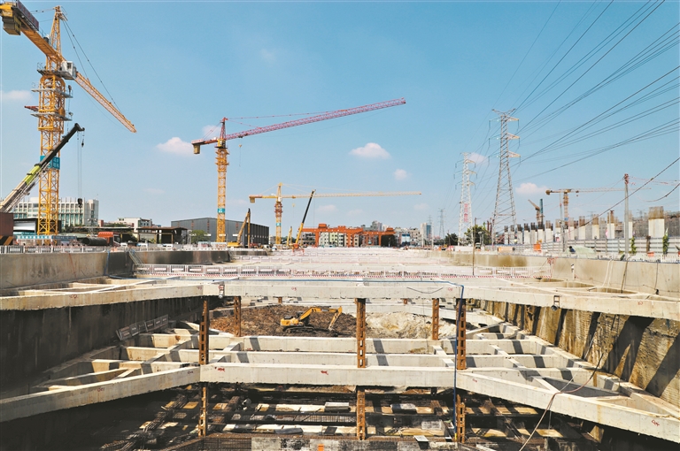 据介绍,广钢新城站是十号线单层面积最大的车站,其北侧靠近110千伏和220千伏架空高压线,正常的起重吊装作业已无法满足施工条件。因此,广州地铁和北京城建的地铁建设者制定了有针对性的施工方案,专门采用高度更低的反循环钻机,基坑内的土石方通过“坑内倒运、单边出土”的方式,巧妙地避开高压线的制约。