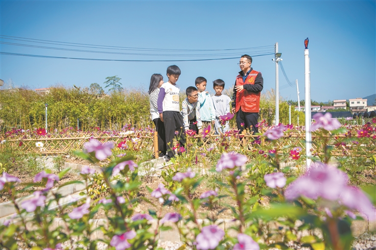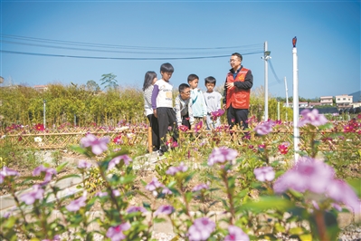 “你们知道这是什么花吗?姜荷花!作为多年生草本热带球根花卉,它原产于泰国,花色有淡雅的粉色、白色,还有浓郁的红色。每当花开时节,它就会盛放,花朵苞片与荷花的花瓣极为相似,且为姜科,故称姜荷花,也被人们称作长在土里的‘荷花’。”记者在小菜园中间循声望去时,花都区委组织部派驻花城村驻村干部马国需正蹲在一簇花骨朵旁,给身边四五个本地花城小学的学生耐心讲解园内的各种花卉和蔬菜品种。