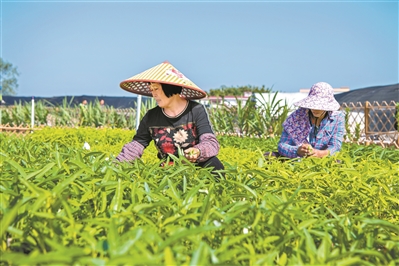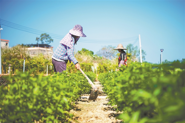 放眼望去,紫色的茄子、翠绿的秋葵、绿油油的菜心……各式各样的时令蔬菜长势喜人,一派生机勃勃的田园景象。菜园内,村民们正在辛勤地劳动,进行打理果蔬、拔草除虫、采摘瓜果等工作,忙碌的身影在菜园内不断来回穿梭,每当他们挥锄翻土抬起头时,脸上都洋溢着收获的喜悦和满足。