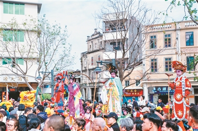 今年赤坎华侨古镇景区围绕“中国年 看赤坎”这一主题,策划了不少新春节目,每天上演场次超100场,好戏不断。景区推出了新春四台重头大戏——从小人物中洞见大时代,精彩还原百年赤坎变迁史的大型多媒体实景演艺节目《归途》;以爱国烈士周文雍、陈铁军刑场作礼堂的动人故事为原型的舞台剧《红色婚礼》;“非遗”项目打铁花、舞火龙交相辉映的蛇年特别版《火秀》;异域华美与岭南侨韵浪漫交融的《摩登时代》,为游客提供了丰富的选择。