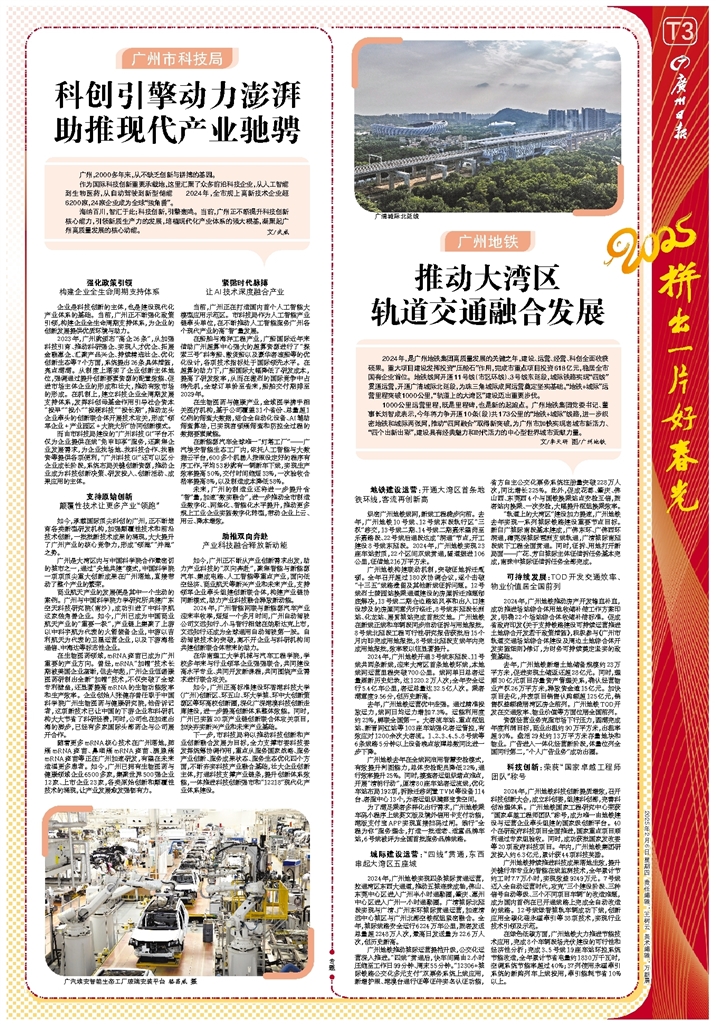 2024年,广州地铁科技创新提质增效,召开科技创新大会,成立科创委,组建科创部,完善科创治理体系。广州地铁国家工程研究中心荣获“国家卓越工程师团队”称号,成为唯一由地铁建设与运营企业牵头组建的国家级创新平台。40个在研政府科技项目全面推进,国家重点项目顺利通过专家组验收。同时,成功获批国家发改委等20项政府科技项目。年内,广州地铁集团研发投入约6.3亿元,累计获44项科技奖励。