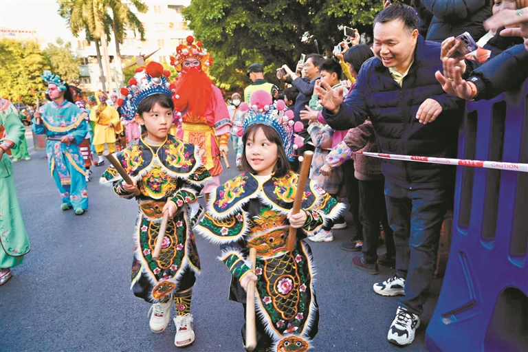 当天,一场民俗风情浓厚的方阵巡游活动火热开场,醒狮舞龙、英歌舞、国潮少年、粤剧戏曲、开笔礼、汉服展演、疍家渔歌等特色方阵逐一亮相。