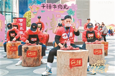 2月9日上午,伴随震天的锣鼓声,四只国家级非遗代表性项目黄连胜醒狮以矫健之姿跳跃步步高,醒狮昂首腾挪间尽显狂野威猛,燃爆现场气氛。潮州非遗展演区成为全场焦点,伴着潮州大锣鼓与英歌舞的表演,来自福田对口帮扶协作地区潮州的“千锤哥”,双锤翻飞,展示牛肉丸的制作绝技,引发了围观市民的喝彩。当热气腾腾的牛肉丸出炉时,市民排起长队来购买这份“非遗味道”。据介绍,“千锤哥”一天两场活动合计锤制牛肉超200斤,现场制作的潮州牛肉丸一销而空。