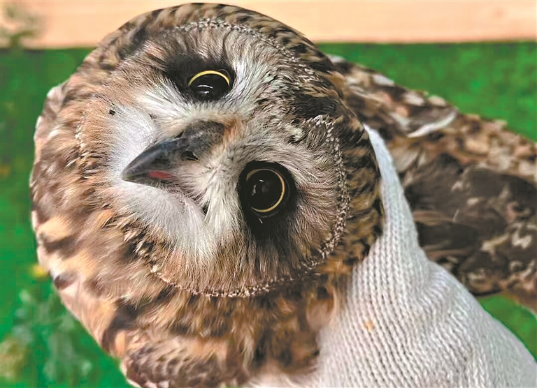 当天,在松山湖寒溪河青鹤湾湿地,一只短耳鸮因左爪被渔线缠住,被困在近10米高的树枝上,虽无助地扑腾翅膀却始终无法挣脱。在接到几名正在拍摄的观鸟爱好者这一救助讯息后,松山湖自然资源局林长办相关负责人立即带上笼子、长竿、线锯等工具赶往现场。由于树枝过高,救助人员带来的工具无法够到受困的短耳鸮。松山湖城管分局园林办等工作人员使用超长修枝工具成功剪断树枝,短耳鸮顺利获救。经现场检查,这只短耳鸮属于国家二级保护鸟类,是猫头鹰的一种。它因被渔线紧勒导致左爪受伤,部分羽毛被磨损,但整体状态尚可。