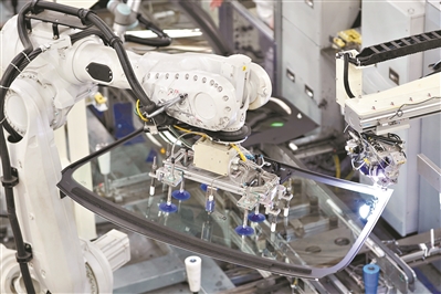 前后挡风玻璃安装站就是一个多机器人融合的工位,从零件上料,到视觉定位、涂胶,再到安装、胶型检测,以及最后的玻璃搭载,均实现全自动化。值得一提的是,涂胶检测完后,还会有两个机器人对车身的钣金进行扫描,在确认钣金、玻璃涂胶都没问题后,汽车才能“出站”。