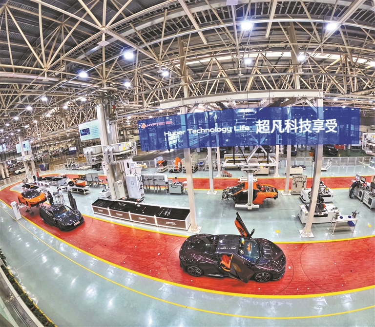 站在“灯塔工厂”的二楼平台上,工厂的大部分工位都能尽收眼底。孙涛指着下方说:“生产线上,我们前一辆车是白色的,后一辆车就是酒红色的,前一辆车用的是常见的平开车门,后一辆车又是酷炫的旋翻鸥翼门,整条生产线上的车辆配置、用户定制的内容都不一样,这就是高柔性化。”