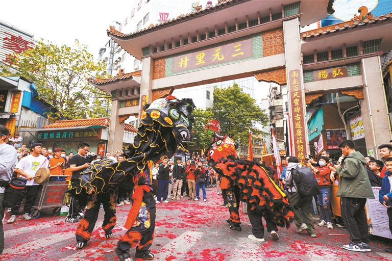广州日报讯 (全媒体记者汤南 通讯员周亚君、杨楚)锣鼓喧天迎客至,醒狮齐聚耀三元。2月15日(农历正月十八),广州市白云区三元里村迎来了延续近600年的元宵盛事。来自粤鄂桂三省区20多个兄弟村的逾50头醒狮,以巡游“闹元宵”的形式共庆佳节,吸引了数千名市民游客驻足围观。