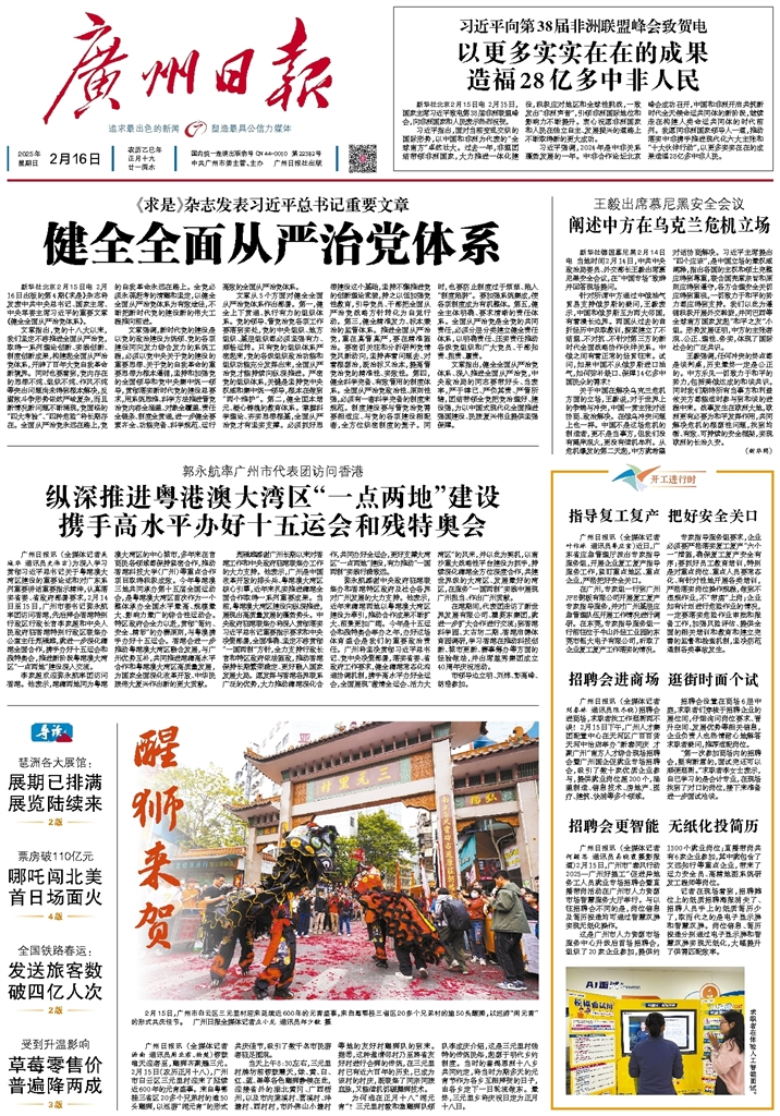 - 纵深推进粤港澳大湾区“一点两地”建设 携手高水平办好十五运会和残特奥会 广州日报讯 (全媒体记者吴城华 通讯员史伟宗)为深入学习贯彻习近平总书记关于粤港澳大湾区建设的重要论述和对广东系列重要讲话重要指示精神,认真落实省委、省政府部署要求,2月14日至15日,广州市委书