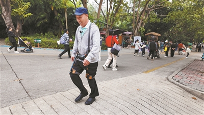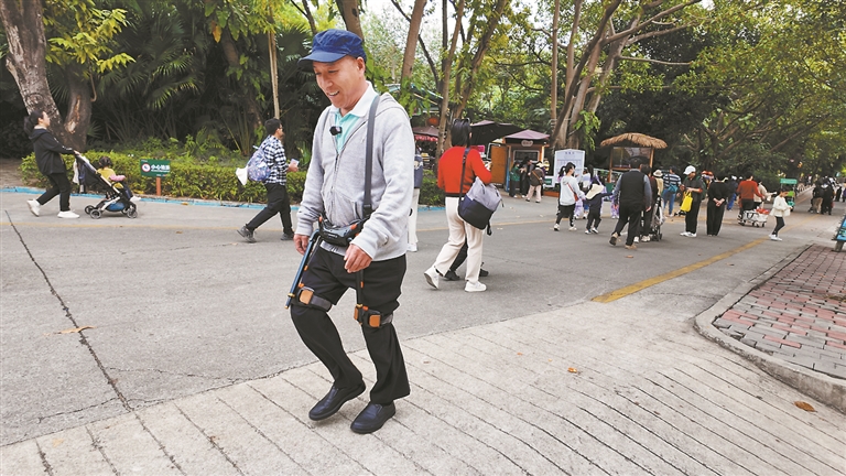 记者在深圳野生动物园入口广场右侧体验区看到,新登场的“游园神器”吸引了众多游客的好奇目光。市民左先生穿戴设备后兴奋地分享感受:“感觉特别轻松!上坡像走平地,下坡也毫无压力,就像有人抬着我的腿走路!”