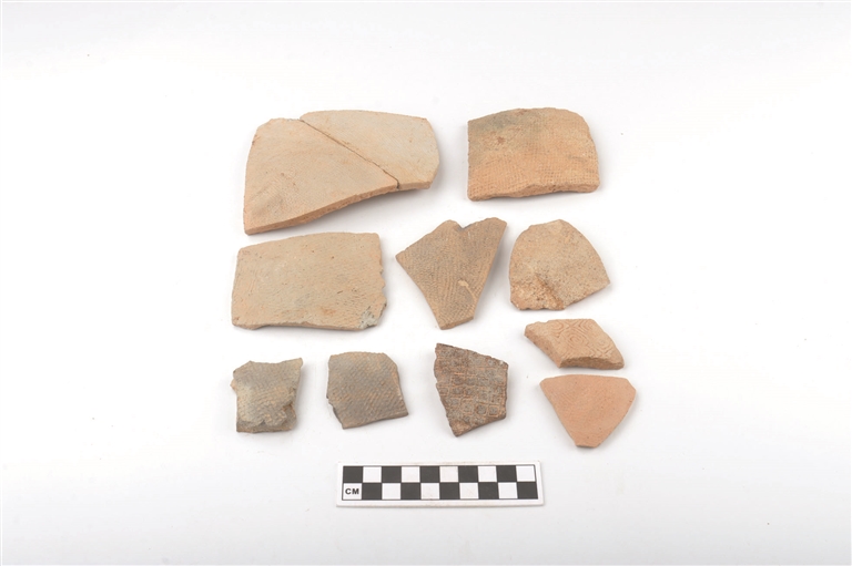 火村二期旧村改造项目(枝山—小塱片)位于黄埔区云埔街道的广澳高速公路两侧,由5个地块组成,总面积约479800平方米。北部山岗西北部1200米为锥林岗遗址,西部约900米为飞鼠隐遗址。考古人员通过“拉网式”地表调查和探孔、探沟等手段,对这一地块进行了详细的调查勘探,总勘探面积达47000平方米。在项目范围的北边地块山岗(喇山),考古人员发现商周时期的灰坑23处,并在地表及断面内采集到夹砂黑陶片、印纹硬陶片和石锛、石戈和砺石等遗物。