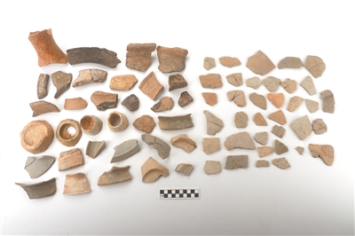 采集到夹砂黑陶片、印纹硬陶片和石锛、石戈和砺石等遗物
