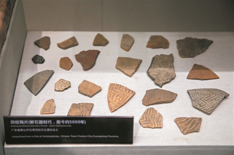 20世纪70年代,中山大学历史系学生在石湾澜石河宕田野考古调查中,发现了一处新石器时期的贝丘遗址,遗址出土了一批石斧、石锛、陶片,这是迄今为止,石湾发掘最早的陶器残遗,将石湾制陶的历史推至距今5000多年前。在广东石湾陶瓷博物馆,记者看到这些陶片,有曲折、方格等丰富的几何纹路,诉说着石湾陶瓷令人叹为观止的历史。
