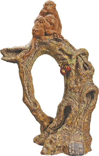 然而,黄炳对动物毛发的塑造一直不满意,直到有一天,他在工坊里意外发现,当竹刀以四十五度角切入湿润的陶胎时,细如胎毛的刻痕竟自然翻卷出毛茸质感。这一发现让他惊喜不已。同时,他又受到国画工笔翎毛技法的启发,用石湾本地含铁成分很高的红土,经过精心沉淀去除杂质后,再加一些细细的瓷土和少量的东莞黏土混合捏塑成动物形象。待陶胎八成干时,用特制的小刻刀在表面一丝一缕地雕琢出鸟兽的羽翎、皮毛等。这样烧成后的作品构图紧凑,韵律感强,极为逼真。