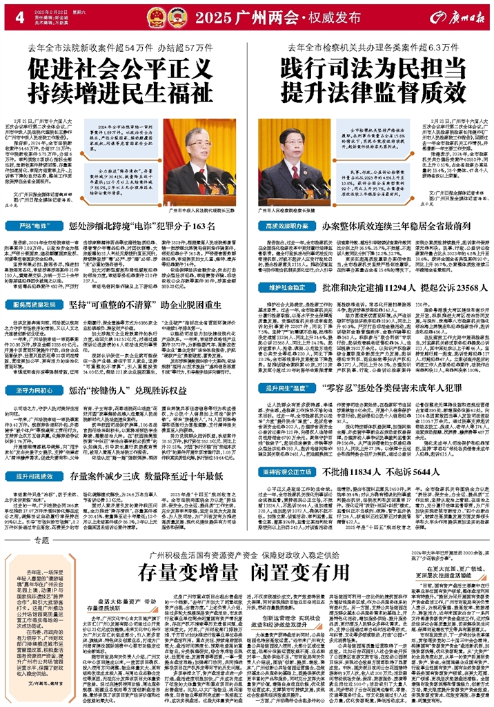 - 促进社会公平正义持续增进民生福祉 2月21日,广州市十六届人大五次会议举行第二次全体会议,广州市中级人民法院代理院长王静作《广州市中级人民法院工作报告》。 报告称,2024年,全市法院新收案件54.65万件,办结57.15