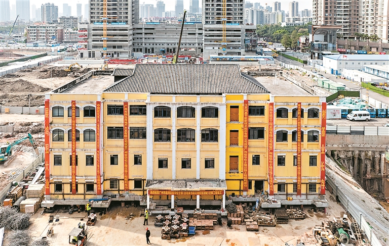 广州日报讯 (全媒体记者吴多)广州荔湾区芳村大道,轰隆隆的中建五局白鹅潭项目部工地外,无数人从工地围挡旁走过,却不知一栋约4600吨重的文保建筑正在进行抬升、旋转、平移。