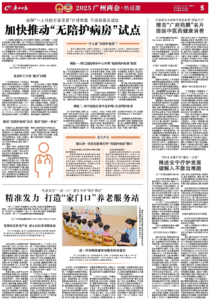 - 加快推动“无陪护病房”试点 人口老龄化进程加快,护工的需求不断增长,如何破解“一人住院全家受累”的陪护难题?在广州市政协十四届四次会议举行的大会发言环节,市政协委员胡桂芬提出改革医院护理管理模式,推进医护一体化“无陪护病房”