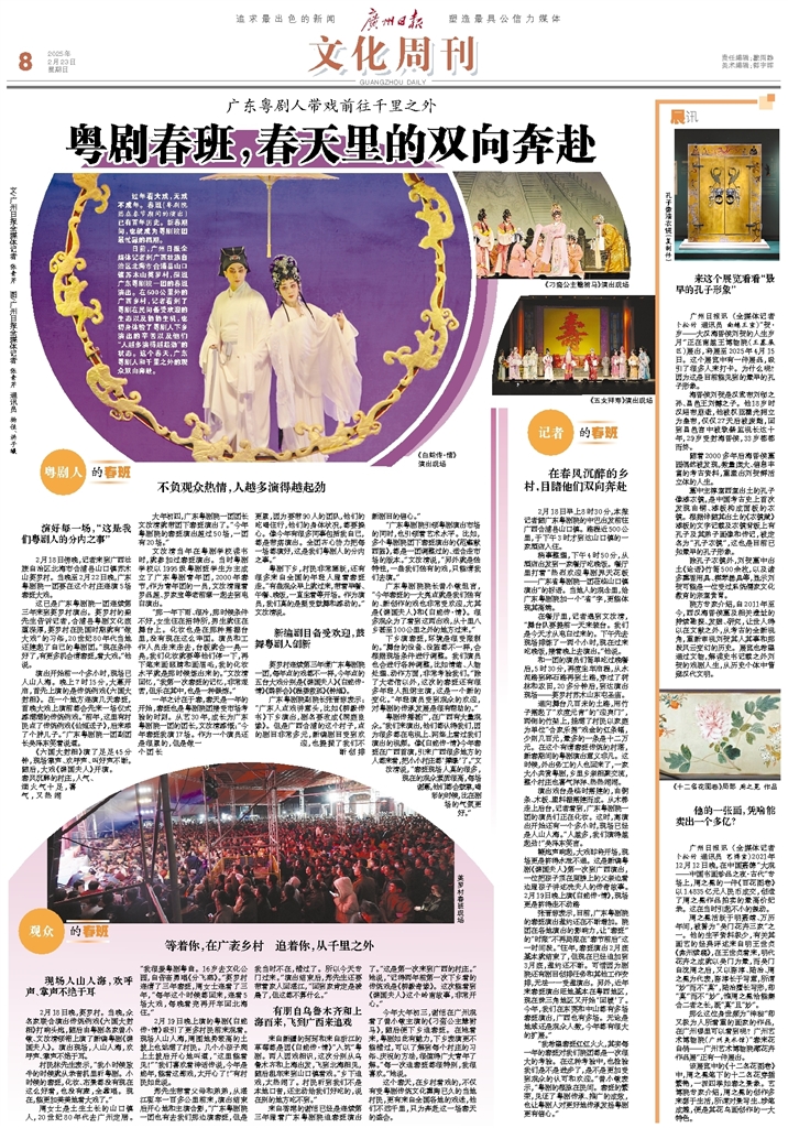 - 粤剧春班,春天里的双向奔赴 过年看大戏,无戏不成年。春班(粤剧院团在春节期间的演出)已有百年历史。新春期间,也就成为粤剧院团最忙碌的档期。 日前,广州日报全媒体记者到广西壮族自治区北海市合浦县山口镇苏木山英罗村,探班