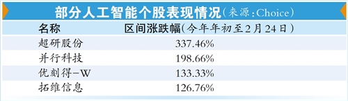 在资本市场,人工智能备受资金青睐。Choice数据显示,今年以来,截至2月24日,全市场约有600只人工智能个股,超八成取得正收益,超研股份、并行科技、优刻得-W等多只个股涨幅超100%。人工智能个股的走高,带动相关主题基金净值增长,同期,全市场200多只人工智能主题基金均取得正收益,约40只基金收益超20%。