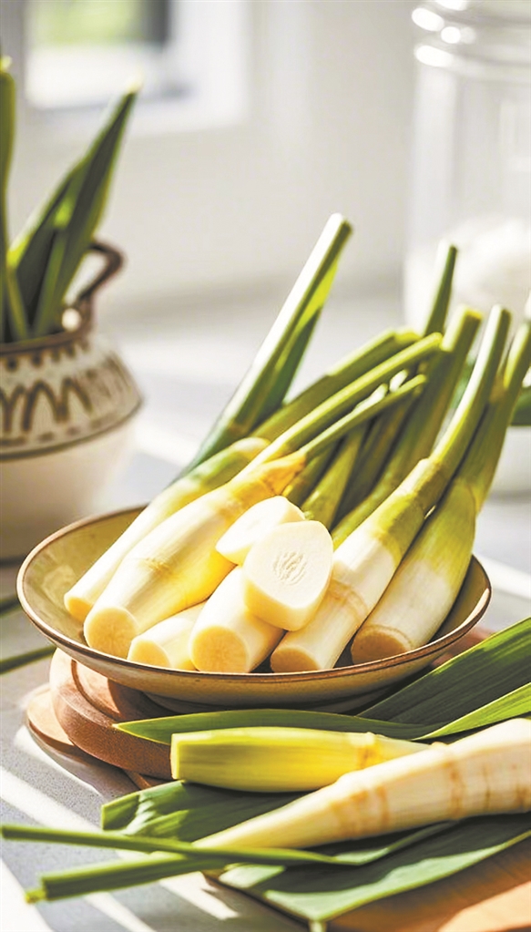 说到茭白的吃法,宋代诗人陆游曾写道:“菰菜堪烹滑,莼羹最软柔。”诗中提到的“菰菜”便是茭白。茭白可清炒,亦可炖煮,甚至还能制成腌菜。清代《调鼎集》曾记载:“茭白炒肉,鲜嫩可口,乃春日佳肴。”将茭白切成薄片,与猪肉同炒,茭白的清甜与肉香融合,油润鲜嫩。此外,茭白还可与虾仁、鸡蛋等搭配,制成茭白炒虾仁、茭白煎蛋等家常美味。江南传统名菜“茭白三丝”,就是将茭白、胡萝卜、青椒切丝,清炒而成,色泽鲜艳,口感脆嫩,是春日宴席上的常客。在广州的仙味实验室里,也有茭白炒湖南老腊肉这道菜肴;而在广州柏悦酒店中餐厅,厨师黄远奖曾以西式来演绎茭白,鱼子酱虾油拌茭白,鱼子酱的咸香和虾油的鲜香为茭白做衬托,茭白的主角光环瞬间点亮,市民在家也不妨一试。