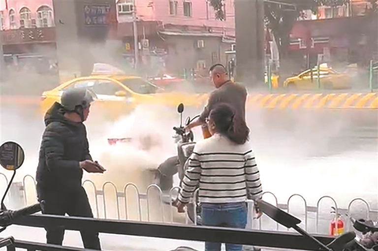 2月20日上午10点半,李辉驾车行驶到广园西路。行驶中,他察觉到前方有异常情况,一辆电单车正不断冒出浓烟,现场情况十分危急。“当时电单车车主在一旁用衣服拍打,却无法控制火势。”李辉心想,电单车电池一旦爆炸,后果将不堪设想。李辉没有丝毫犹豫,他迅速将出租车停靠在起火点的前方安全位置,随后下车打开后备厢取出灭火器,迅速朝起火点跑去。此时,电池冒出的浓烟越来越大,并传来“噼噼啪啪”的响声,火苗已经从电池蹿出。李辉熟练地操作灭火器,对准电池位置进行扑救,直到灭火器耗材耗尽。