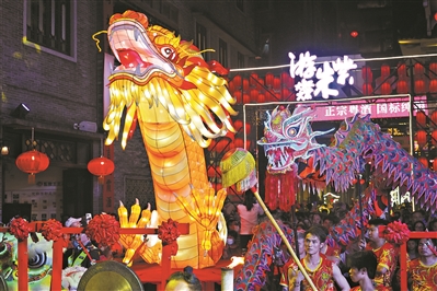 朱紫街主道上,一条长达168米的巨型金龙蜿蜒腾跃,龙头与龙尾采用非遗扎花灯工艺,每位前来“游朱紫”的市民都感受到“龙抬头”气势。朱紫街内还设置诸多打卡点,“孖仔阁”寓意着日子红红火火,好事成双;“埕墙”(粤语谐音“情墙”),更是让成双成对的恋人们流连忘返。现场设置了宋潮雅集时尚文创区、非遗摊位区,文创产品、木版年画、扎狮头等物品琳琅满目,让市民游客一站式体验佛山丰富多彩的传统及新潮文化。