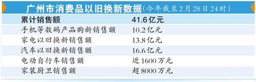 广州日报讯 (全媒体记者 许晓芳、赵方圆、文静)2025年开年,广州以旧换新政策迎来“加码升级”,家电、数码、汽车三大品类齐发力,掀起全民“焕新潮”。记者从广州市商务局获悉,今年截至2月28日24时,广州市消费品以旧换新累计销售额41.6亿元,其中,手机等数码产品购新销售额10.2亿元;家电以旧换新销售额13.8亿元。随着更多家电品类纳入补贴、老小区成换新新增长点、服务标准逐步完善,“以旧换新”这场消费升级行动有望持续在广州产生乘数效应。